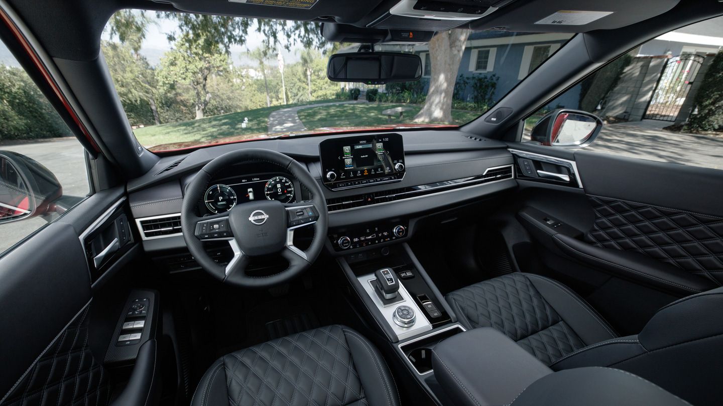 The Rogue PHEV's 12.3-inch digital instrument cluster displays real-time power flow, battery charge level, and electric range estimates. A 9-inch touchscreen features wireless Apple CarPlay and wired Android Auto, with a 10-inch head-up display projecting speed and navigation data onto the windshield.